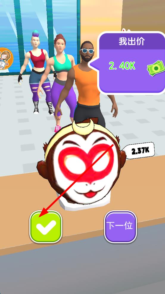3、成功抵达关卡终点,进入交易环节,合理出价售卖面具,获取金币解锁新面具、开启新关卡。