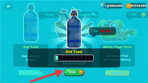 3、在氧气瓶升级界面,点击绿色“1000”按钮,消耗金币升级“OldTank”,提升潜水时长等能力。