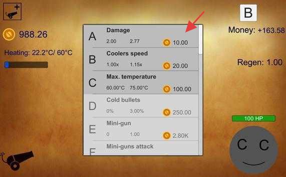 3、进入升级界面,花费金币提升Damage等属性,增强火炮能力,助力通关。