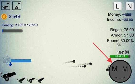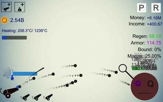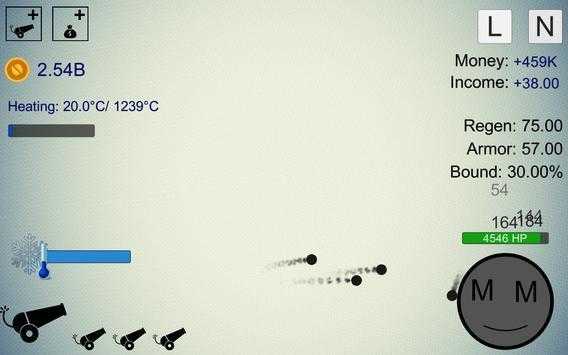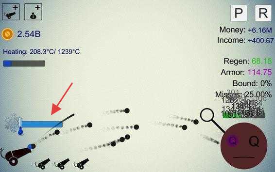 1、在游戏界面,利用左侧蓝色进度条,操控火炮发射,躲避敌人攻击,上方显示金钱、温度等数据。