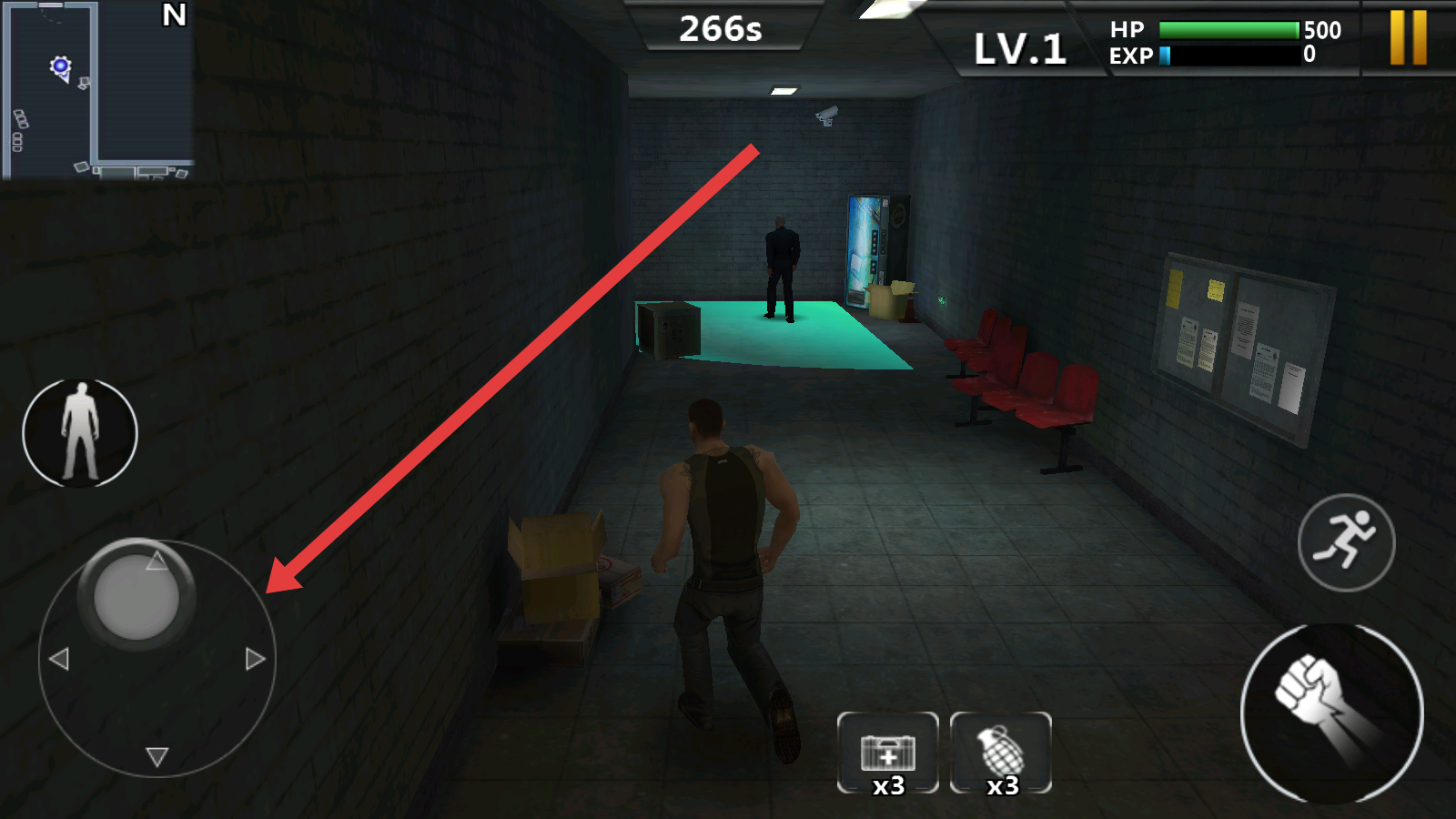 2、进入关卡,用左侧虚拟摇杆控制移动,按箭头指向,靠近目标区域,注意场景中敌人。