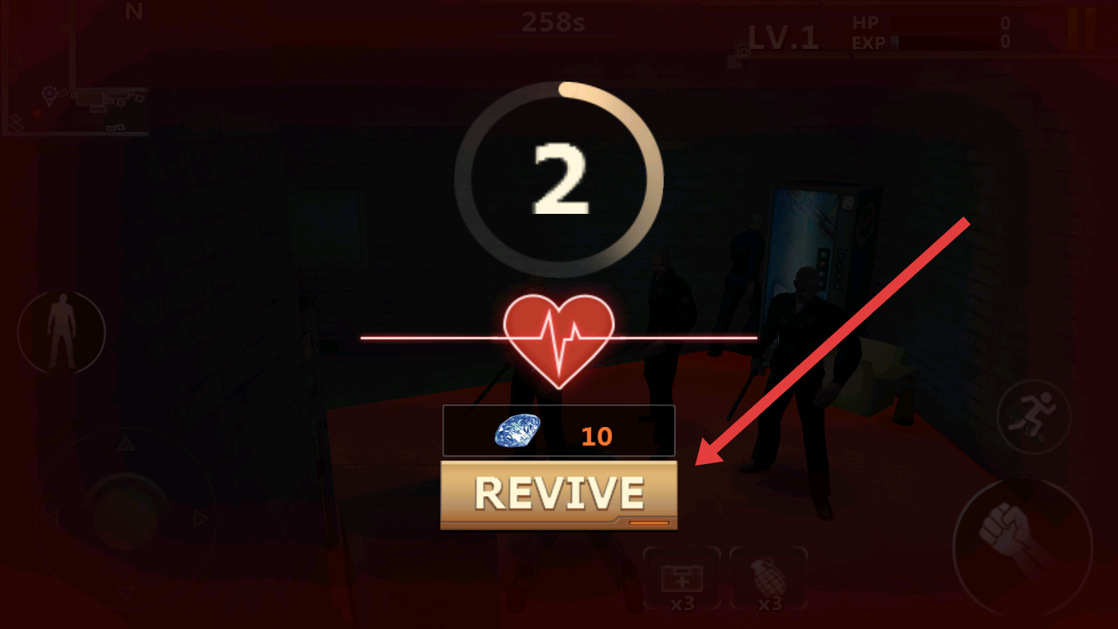3、若角色倒地,按箭头指示,消耗道具(如蓝色宝石)点击“REVIVE”复活,继续战斗,推进故事进程。