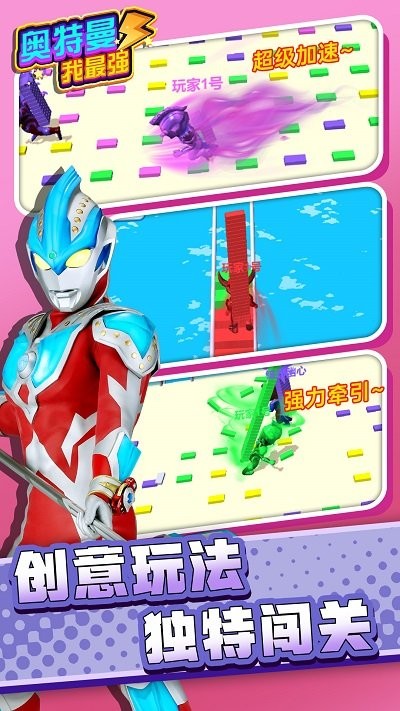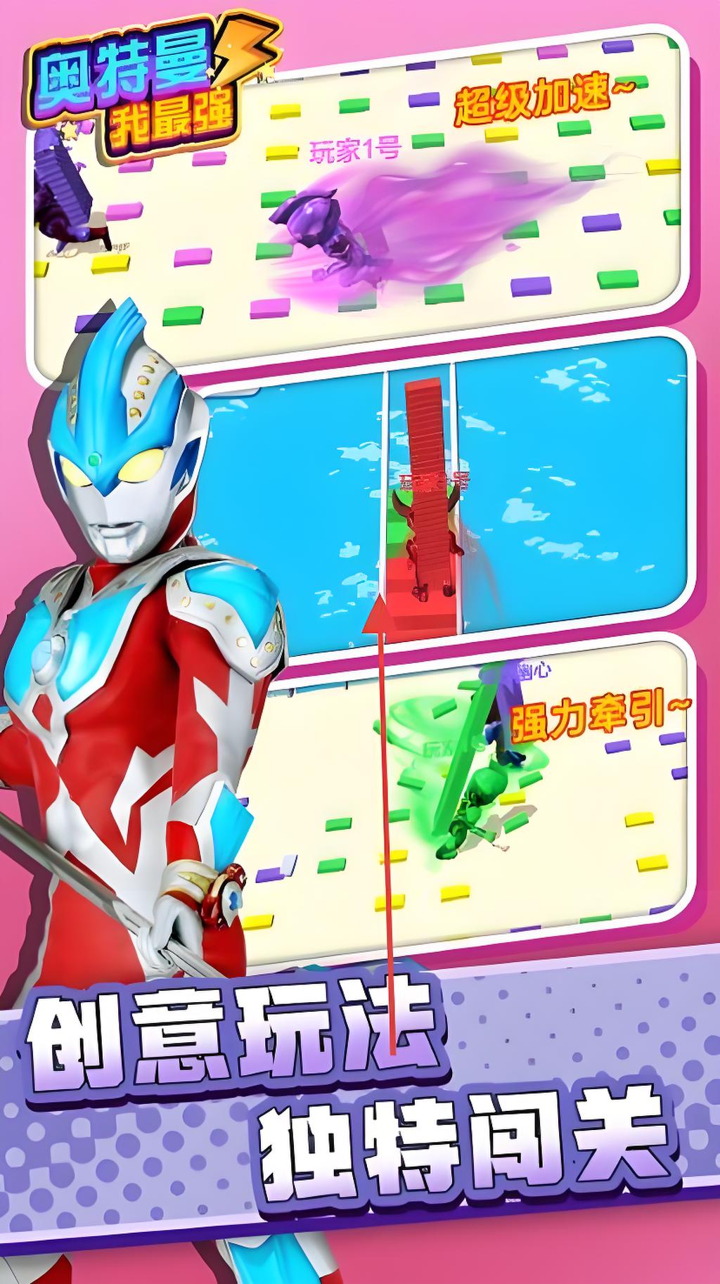 奥特曼我最强是一款以经典奥特曼角色为主题的创意跑酷作品,玩家将置身于充满科幻感的未来城市跑道,化身为光之巨人开启魔性跑酷冒险,可自由挑选迪迦、赛罗等多个奥特曼皮肤,操控角色在奔跑过程中收集同色木板,通过搭建桥梁跨越深渊、避开陷阱,在快节奏的挑战中感受流畅的动作设计与色彩鲜明的场景切换。