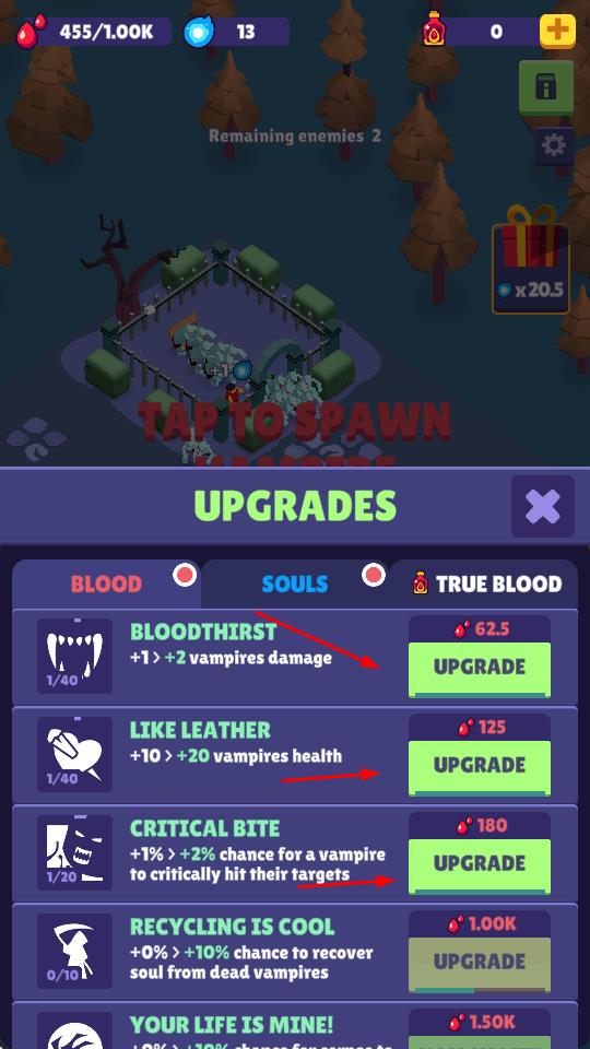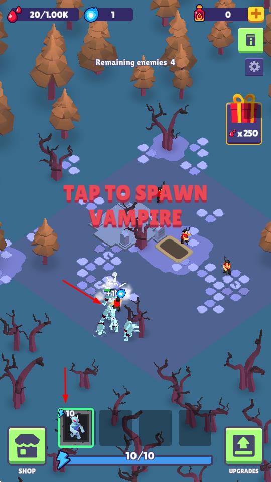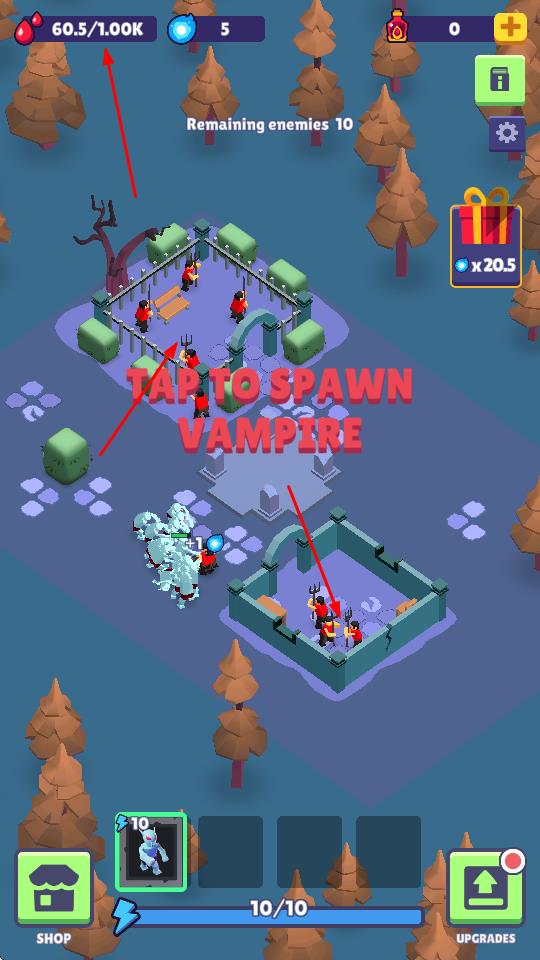1、点击“TAP TO SPAWN VAMPIRE”,消耗资源召唤吸血鬼单位,投入战场对抗敌人,是基础战斗操作。