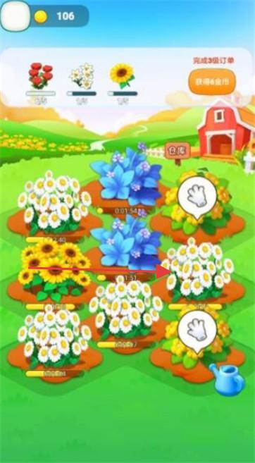 3、点击“仓库”,可管理收获的花卉,完成订单(如界面提示的订单任务),获取金币,用于升级花园、解锁新花卉品种。