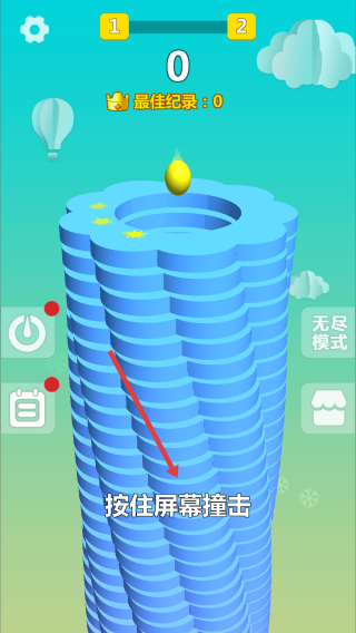 1、点击“按住屏幕撞击”,操控黄色小球坠落撞击蓝色塔层。