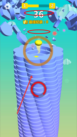 2、小球下落时,避开黑色圆环,击碎蓝色层,数字(如36)显示击碎层数。