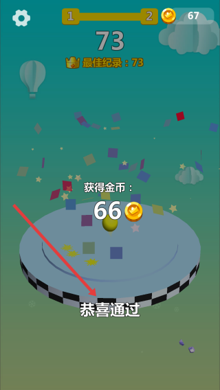 3、成功坠落到底部平台,显示“恭喜通过”,记录最佳层数(如73),获得金币(如66)。