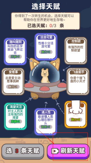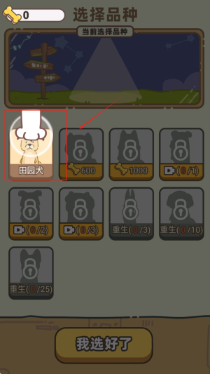 1、在初始界面选择心仪犬种,注意查看各品种所需骨头数量或重生次数要求,确认后点击我选好了进入下一步。