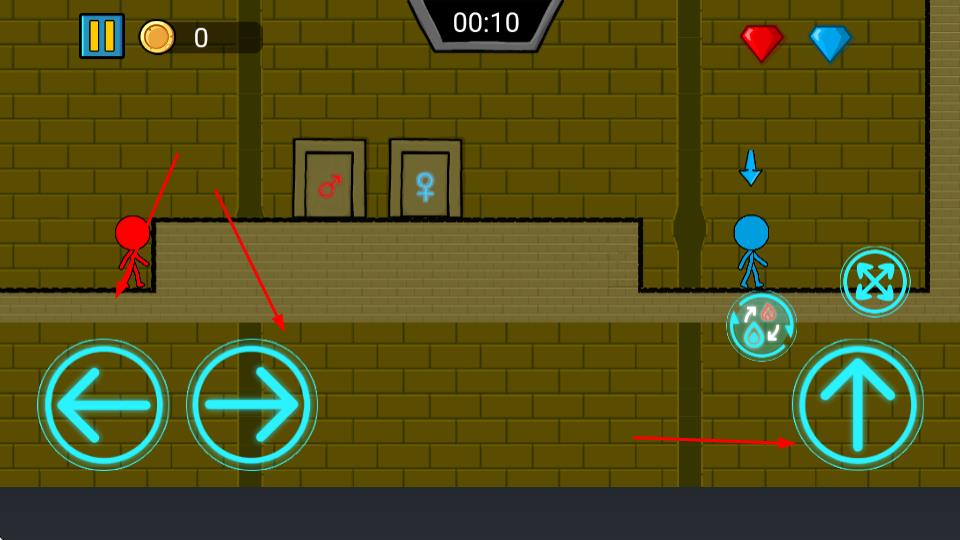 1、玩家分别操控红色和蓝色火柴人,利用屏幕下方的方向键和功能键控制角色移动、跳跃及使用技能。