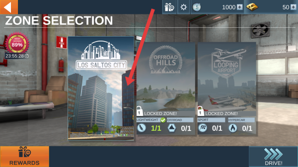 2、在区域选择界面,选择【洛斯萨尔托斯市】,该区域为初始可玩区域,点击后即可进入城市驾驶场景。