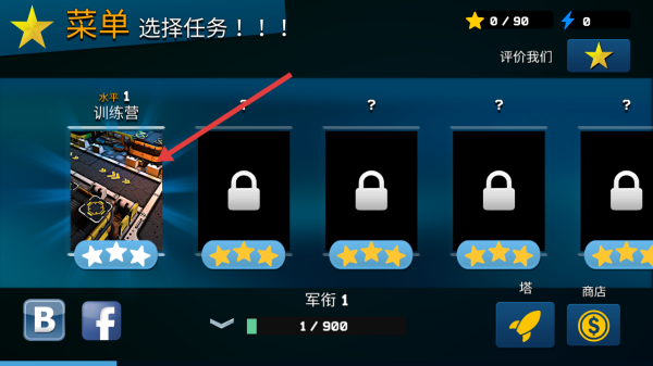 2、在任务选择页,选【水平1训练营】关卡(解锁状态),熟悉游戏基础操作与塔防机制。