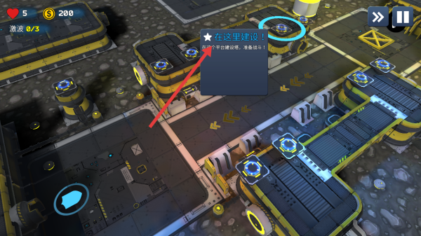 3、战斗时,按提示在蓝色光圈位置建塔(如“在这里建设”标识),消耗金币布置防御,抵御敌人。