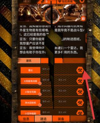 1、对话界面,“亚当”交流内容提及外星生物、制造图纸、雷达等,可点击对应功能按钮推进。