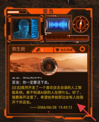 2、角色“亚当”信息界面,显示“救生舱”“钻石商城”,有其留言“你一定要活下去”等。