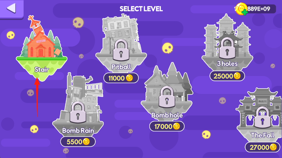 2、关卡选择界面SELECLEVEL,可解锁关卡Stair,Pitball,3holes等,不同关卡有金币解锁要求。