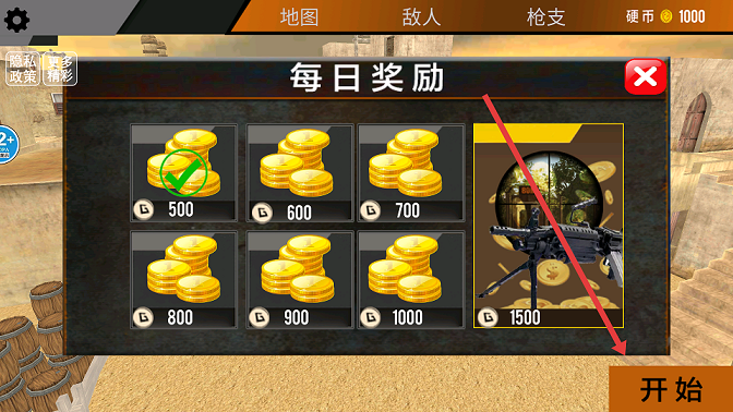 1、打开游戏,领取每日奖励,用于购买和升级装备,然后点击开始进入游戏。