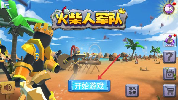 1、进入【火柴人军队】,点击【开始游戏】,开启火柴人战斗冒险,体验策略对战。