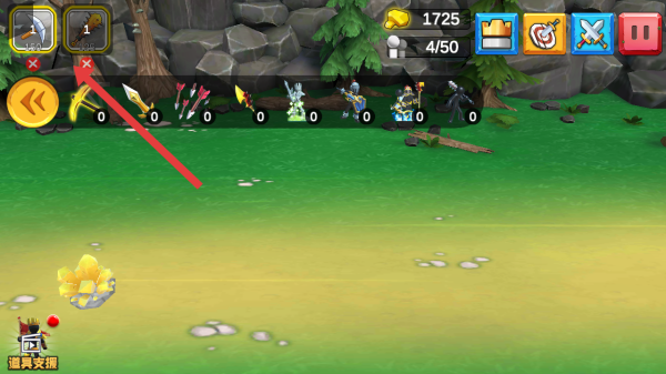 3、战斗界面,点击上方武器栏(如红色箭头指向),切换装备,搭配兵种,迎战敌人。