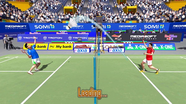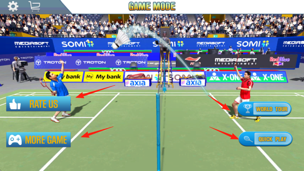 1、羽毛球游戏模式选择界面GAMEMODE,有评分,更多游戏,世界巡回赛,快速游戏按钮。