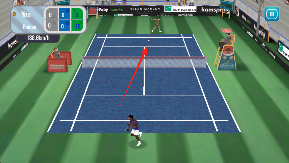3、网球游戏对战界面,显示玩家“You”和对手“Romas”的比分、发球速度“101.4km/h”,有暂停按钮。