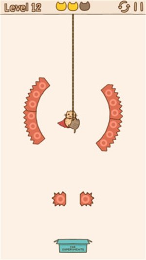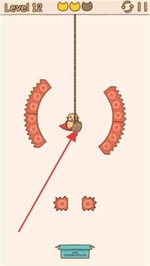 2、在关卡(如Level12)中,观察猫咪悬挂位置与齿轮等障碍,规划下落路径,避开危险。