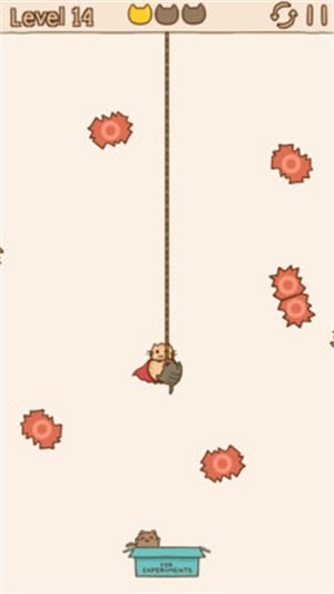 1、触屏控绳搭建路径:进入关卡后,通过触摸屏幕控制绳子降落方向,点击合适位置固定绳子,为小猫咪搭建跨越陷阱或到达高处的路径,注意躲避旋转机关与敌人攻击。