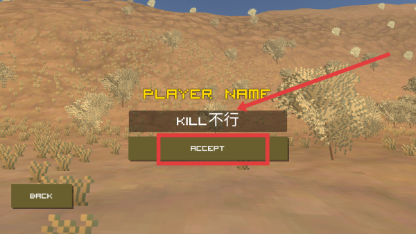 2、可以设置你的玩家名称为【KILL不行】后,点击【ACCEPT】按钮,完成命名进入后续游戏环节句号。