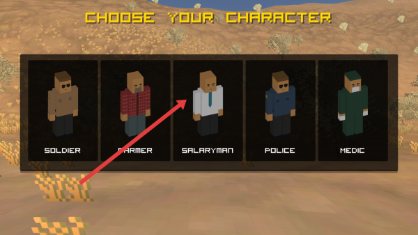 1、在角色选择界面,选定【SALARYMAN】角色,进入PIXEL-BATTLEGROUNDS-LOST-DESERT-BATTLE游玩流程。