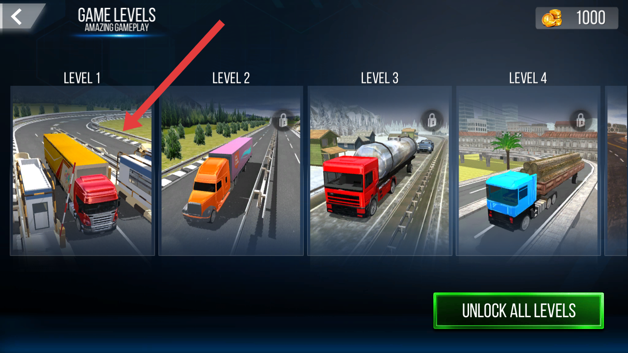 2、在关卡选择界面,点击【LEVEL1】进入第一关,开始体验卡车驾驶模拟的初始关卡。