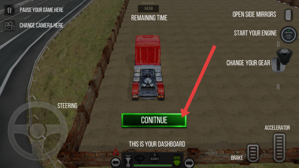 3、在游戏中需要点击【CONTINUE】按钮,继续进行卡车驾驶,按提示操作推进游戏进程。