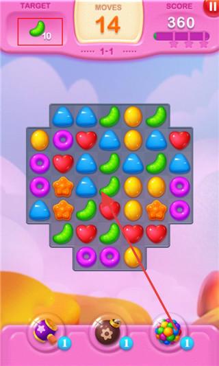3、关卡内,目标是收集10个绿色糖果,14步内滑动同色糖果消除,达成目标推进游戏。