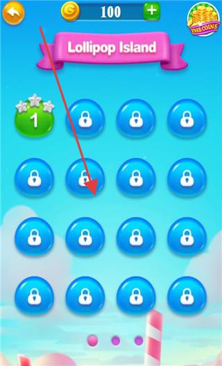 2、在“Lollipop Island”关卡页,选已解锁的【关卡1】(绿色数字1图标),进入消除挑战。