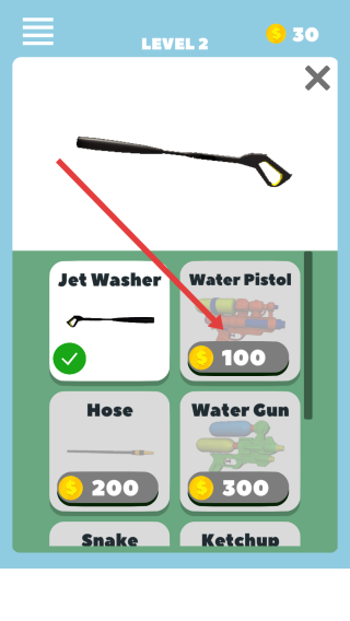 3、到LEVEL-2,若金币足够,可以点击【Water-Pistol-100】消耗金币购买该武器,助力更高效清洗。