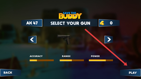 3、在武器选择界面,确认初始手枪的精准度、射程等属性后,点击右侧【PLAY】,携带所选枪械进入关卡推进救援。