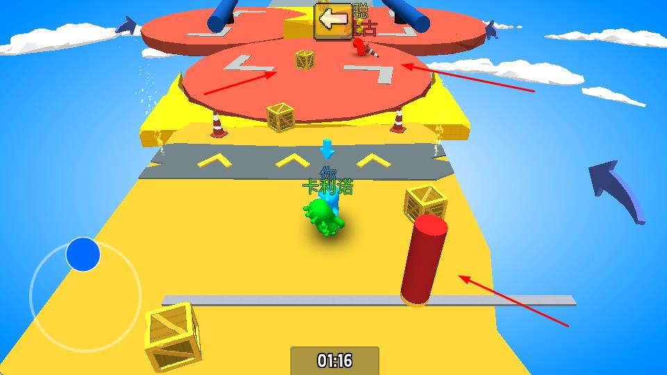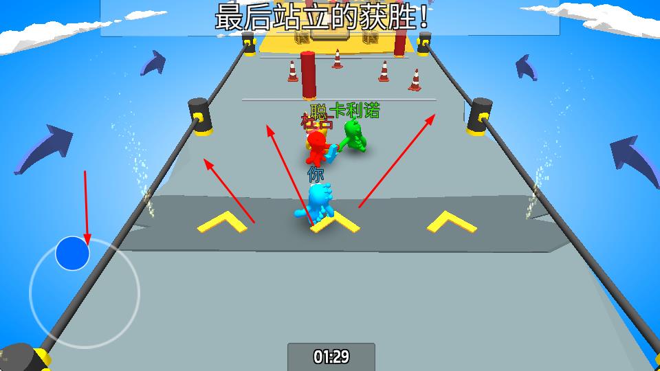 2、进入赛场,操控角色与其他玩家对抗,利用武器、场景机关,把对手打下平台,争取“最后站立”。