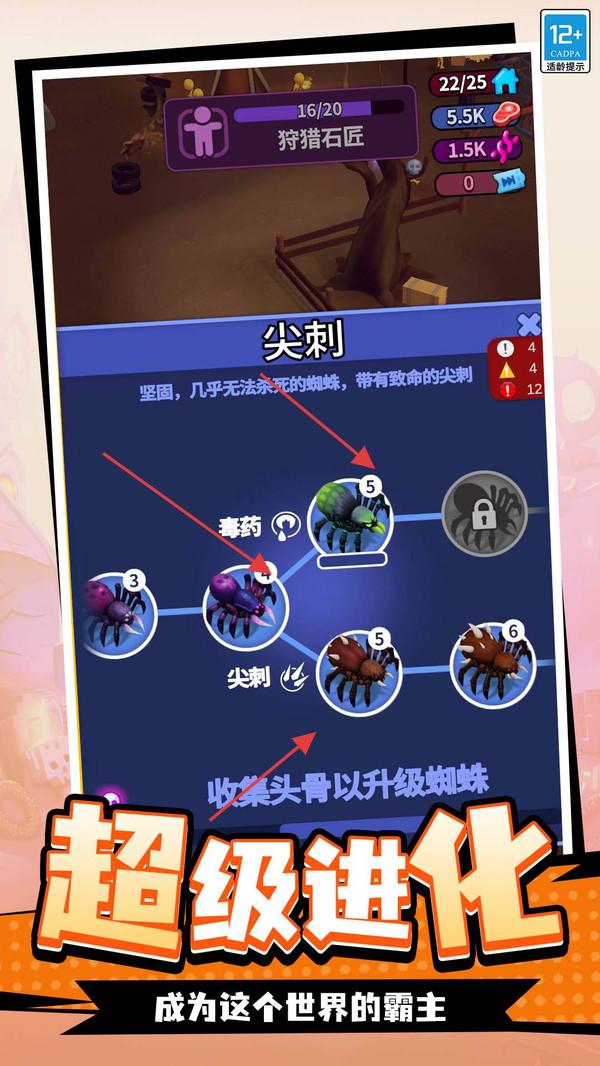 2、收集头骨等资源,在“超级进化”界面,为蜘蛛升级、解锁新种类,提升军团战力。