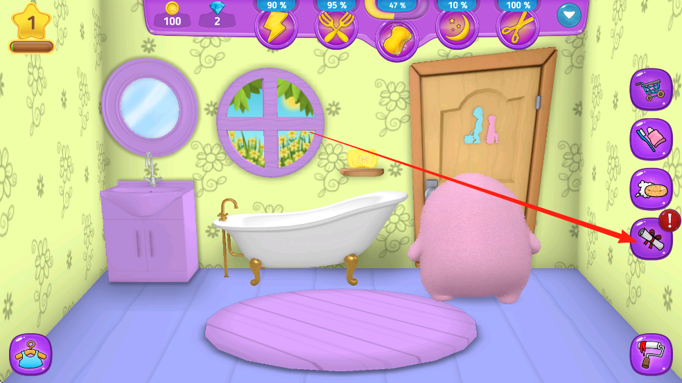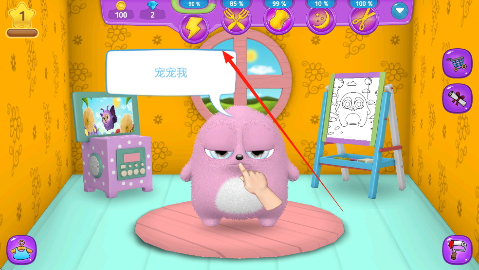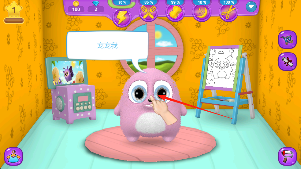 1、基础互动逻辑:点击屏幕触发喂食、抚摸等操作,滑动屏幕切换场景视角,长按道具栏选择服饰进行装扮,操作简单易上手。