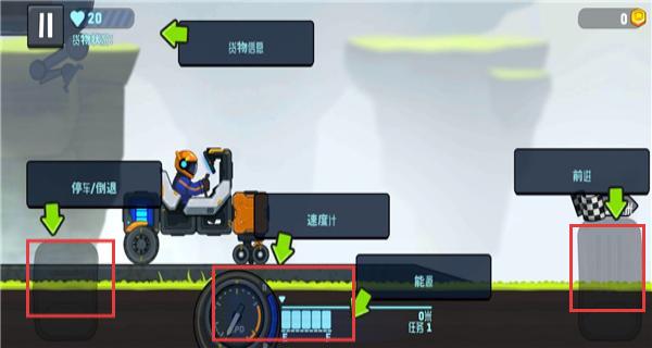 2、走边按钮是刹车键,右边按钮是加速键,上方是货物信息,中间是速度和能源。
