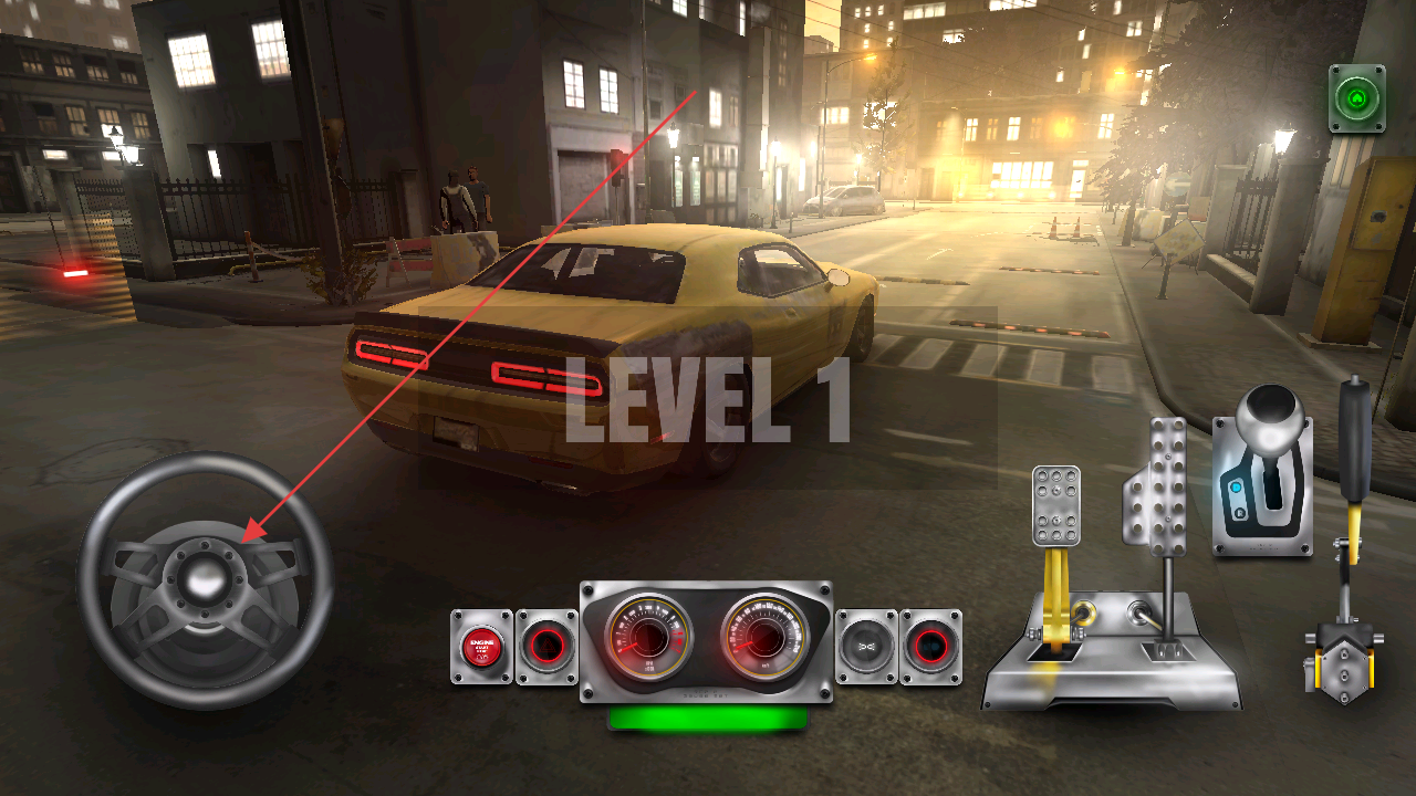 3、在驾驶场景,通过方向盘、踏板等操控赛车,在城市道路行驶,完成关卡任务。