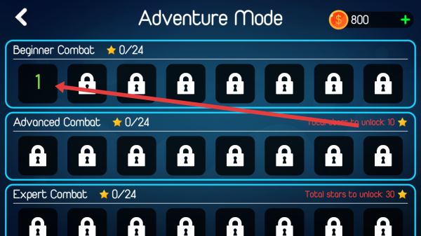 3、在冒险模式,选【Beginner-Combat】的第1关,点击进入,操控火柴人战斗,积累星星解锁更多关卡。