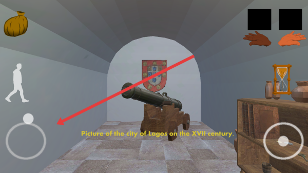3、在城堡场景内,操控左侧虚拟摇杆移动,靠近XVII世纪Lagos城图片及大炮,触发探索、交互等游戏内容。
