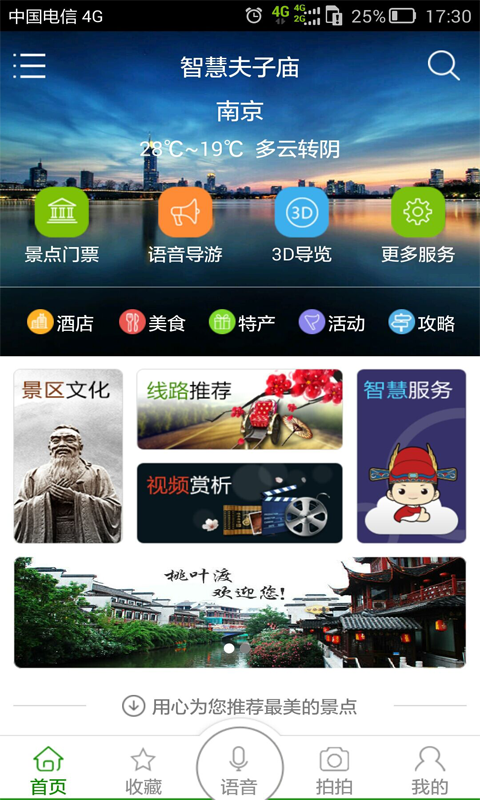 智慧夫子庙是南京本地化的旅游平台,通过移动客户端为南京本地和外地的游客提供全面的南京本地化旅游服务,包括景点门票、语音导游、美食小吃、特产礼品、酒店客栈、休闲娱乐、本地特色民俗活动等信息的深度呈现,向游客提供最具性价比的产品和优质信息。