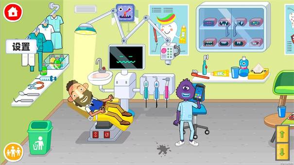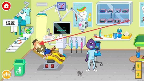 1、进入牙科诊室,点击互动元素(如牙科工具、药品柜),模拟给患者治疗牙齿。