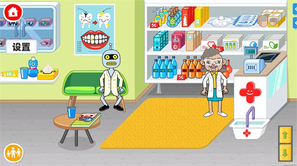 3、在药房场景,点击货架药品、机器人医生,进行配药、问诊等模拟,探索医院玩法。