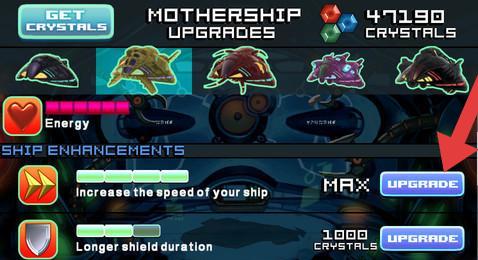 3、进入母舰升级界面,点击【UPGRADE】按钮,消耗水晶提升飞船速度或护盾持续时间等属性。