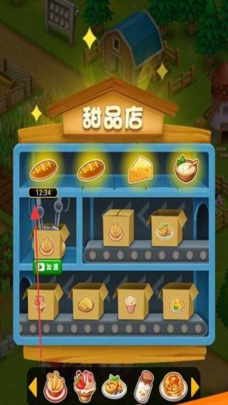 2、进入“甜品店”,选择食材制作甜品,放入货架售卖,赚取金币。