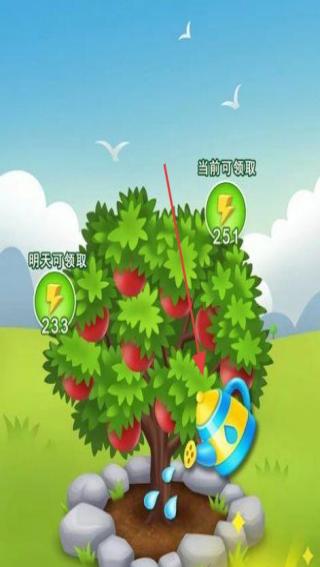 3、在果树种植区,点击水壶浇水,等待果实成熟,领取电力奖励,升级农场。