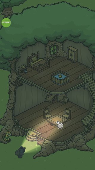 2、呈现的是树屋内部场景,包含床、柜子、水池、桌椅等家具,还有角色互动元素,属于该治愈系冒险典型场景,用于展现月兔的生活环境。