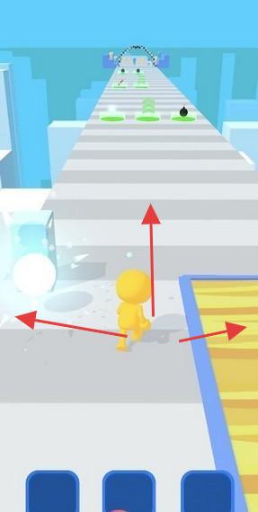 1、操控角色沿阶梯赛道向前跑,左右移动躲避障碍、收集道具,保持前进。